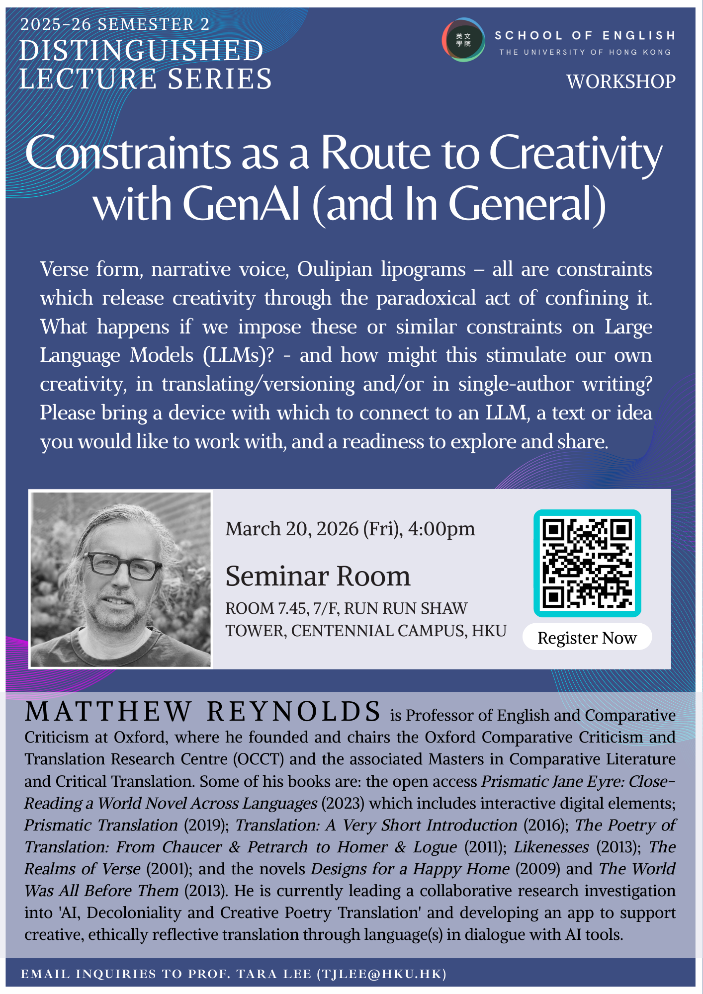 Matthew Reynolds is Professor of English and Comparative Criticism at Oxford, where he founded and chairs the Oxford Comparative Criticism and Translation Research Centre (OCCT) and the associated Masters in Comparative Literature and Critical Translation. Some of his books are: the open access Prismatic Jane Eyre: Close-Reading a World Novel Across Languages (2023) which includes interactive digital elements; Prismatic Translation (2019); Translation: A Very Short Introduction (2016); The Poetry of Translation: From Chaucer & Petrarch to Homer & Logue (2011); Likenesses (2013); The Realms of Verse (2001); and the novels Designs for a Happy Home (2009) and The World Was All Before Them (2013). He is currently leading a collaborative research investigation into 'AI, Decoloniality and Creative Poetry Translation' and developing an app to support creative, ethically reflective translation through language(s) in dialogue with AI tools.